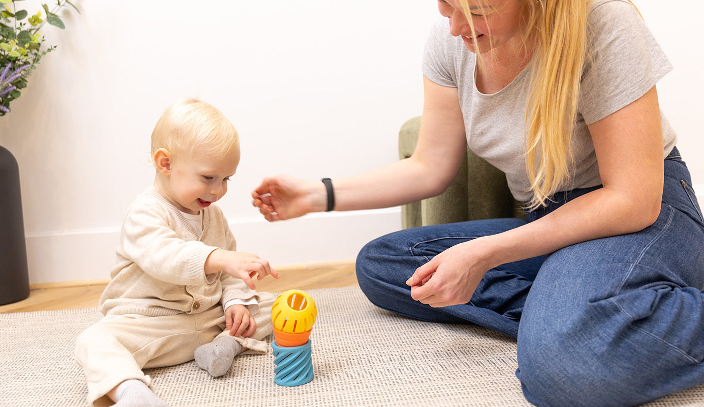 Au fil du temps, l’enfant explore Flex différemment : il le met dans la bouche, le lance, le fait rouler, puis découvre comment emboîter et empiler les pièces, développant ainsi sa coordination œil-main et sa logique.